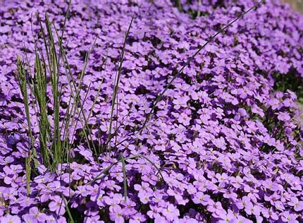 Megjelenés: Alacsony, párnaszerű növekedésű évelő; apró, örökzöld levelek; kora tavasszal bőséges virágzás lila virágokkal. Virágzatai szinte teljesen beborítják a növényt.