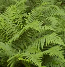 • Megjelenés: Az erdei pajzsika nagytermetű, dekoratív páfrány, amely 60–100 cm magasra nő. Levelei hosszúkásak, finoman szeldeltek, élénk- vagy mélyzöld színűek. A levélrózsa sűrű és szabályos, így a növény egész évben rendezett, természetes megjelenést biztosít. A lombozat tavasszal frissen kihajtó, feltekeredett „pásztortáska” alakú leveleivel különösen látványos.