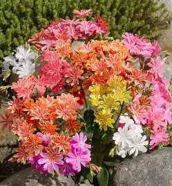 • Megjelenés: A Lewisia alacsony termetű, 10–20 cm magas évelő, amely tőlevélrózsát képez húsos, hosszúkás, élénkzöld levelekből. Virágai csillag alakúak, gyakran csíkos mintázatúak, és a rózsaszín, narancs, fehér, sárga vagy piros árnyalataiban nyílnak. Tavasztól akár nyár közepéig folyamatosan virágzik.